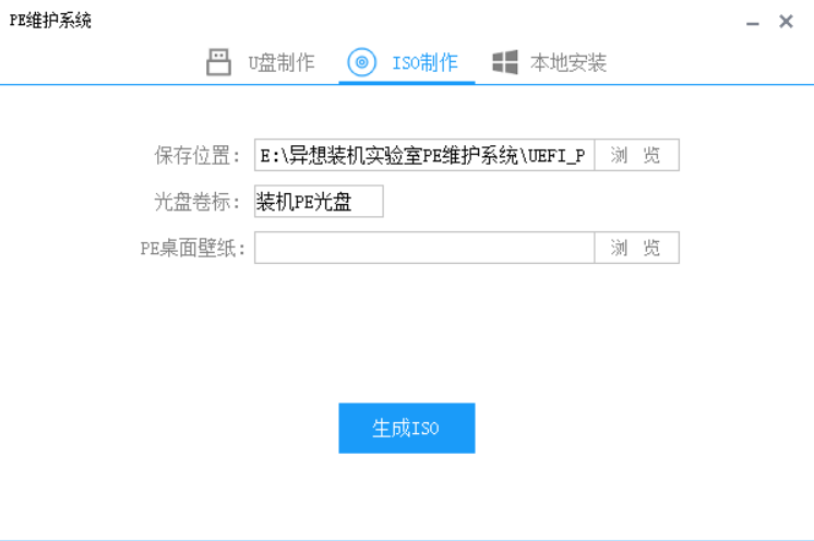 答: 有的,为方便制作启动盘已与写入程序合并。打开异想装机实验室PE维护系统优盘启动程序点击“生成ISO”按钮,选择ISO文件位置,即可生成ISO文件进行镜像刻录、虚拟机测试等操作。