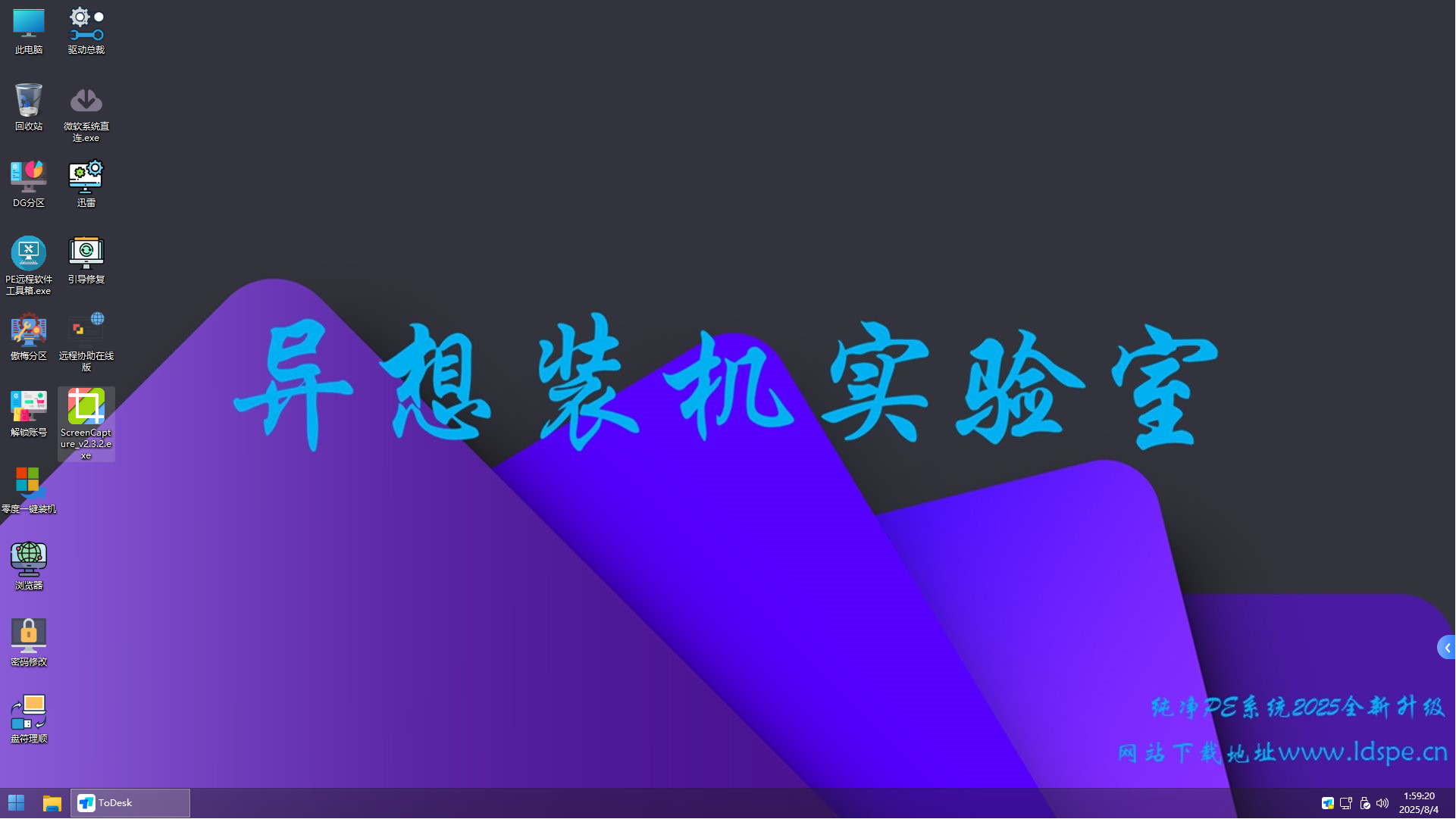 异想装机实验室PE维护系统是一款系统预安装环境(Windows PE),基于雷电PE内核修改而来。它具有简约、易操作等特点,使用起来十分人性化。以U盘作为使用载体,空间更为充分,携带更为方便。同时整合各种装机必备工具,有效提高系统安装效率。